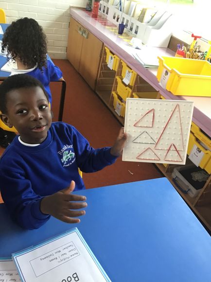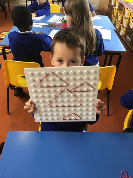 In Maths we have focused on 2D and 3D shapes. We have looked at their properties and the different faces that they have. The children have experimented by making 2D shapes on a geoboard, they have also tested out building towers with the 3D shapes to see which shape best suits the bottom and top of the tower. The children decided that a cuboid was best for the bottom and that a cone or pyramid could only go on the top of their tower.