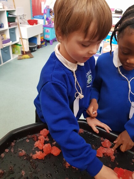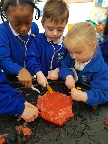 As part of our continuous provision, children have been investigating ways to melt the jelly ice block. The children talked about the ice being a hard solid and said that the heat and sun will help it to melt. The children used a variety of tools to cut the ice and talked about how it felt slippery and wet. It certainly did not take long to melt and resulted in ‘slushy red water’. It smelt of strawberries and was great fun!