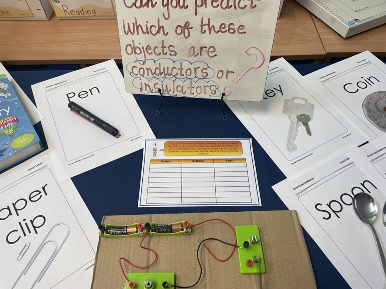 This term we looked at Electricity. We investigated different circuits and their different components. We looked closely at different circuits that have been connected differently and had to predict whether they would light up a bulb. There was great discussion around which parts of the components would be necessary in order for this to work and which components won't light the bulb if they were not placed on the circuit correctly. We particularly enjoyed our lesson on conductors and insulators. We had to predict, from the objects on the table, whether they were able to conduct electricity or not. We loved testing this out!