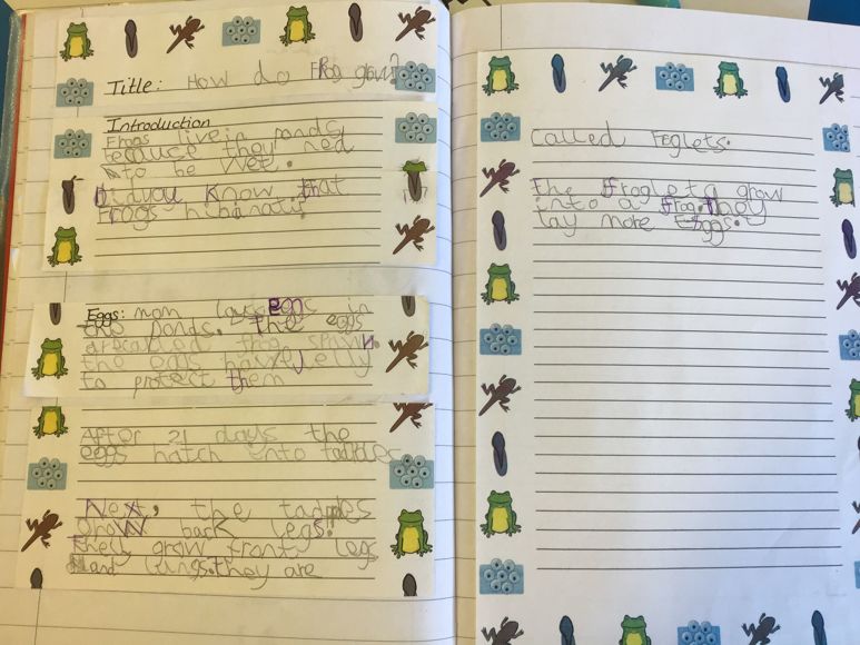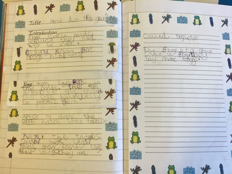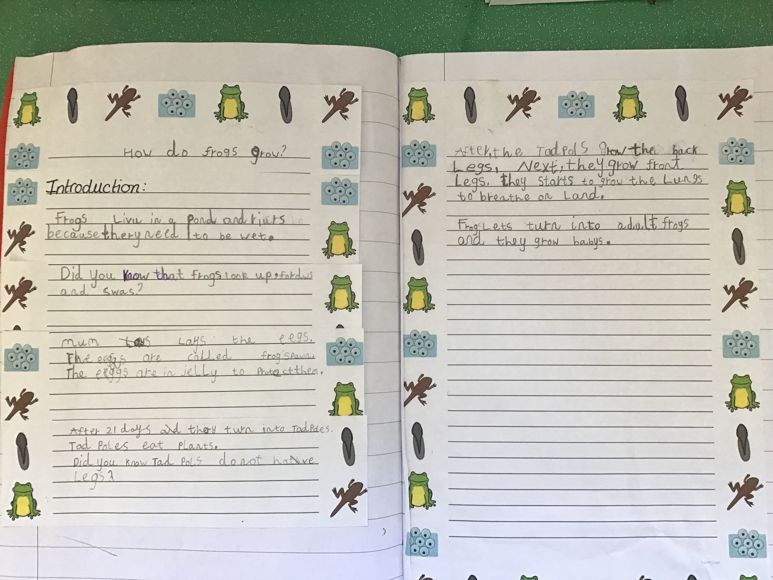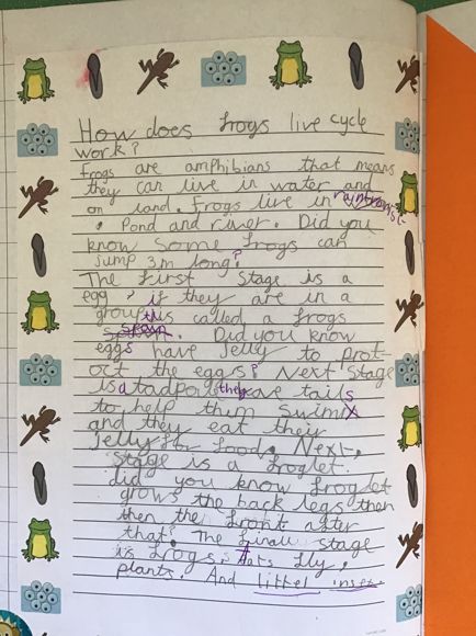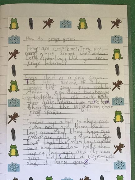 In English, we have written detailed explanations of the life cycle of frogs and found out lots of interesting facts. Did you know that frogs can look sideways, forward and up all at the same time? We worked on including questions and adding commas to separate items in a list.